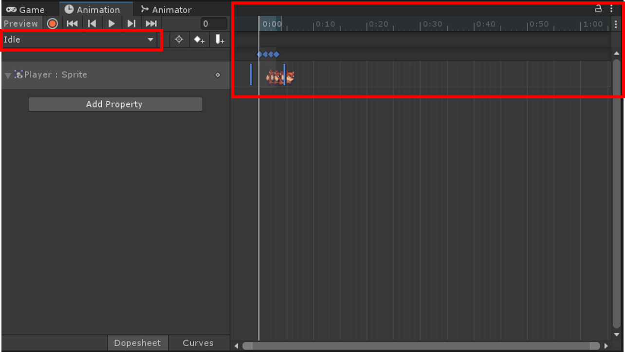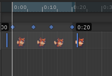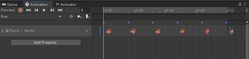 Player:Sprite 프로퍼티를 드래그로 전부 선택하고, 우측 파란색 바를 이용해 적당한 속도로 조절해봅시다.