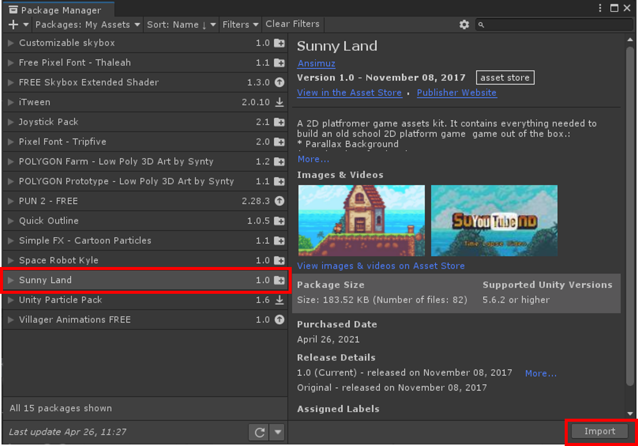 패키지 매니저가 뜨고, 지금까지 자신이 구매한 에셋들이 나오고, 이번 경우에는 Sunny Land에셋이 선택되어있습니다.